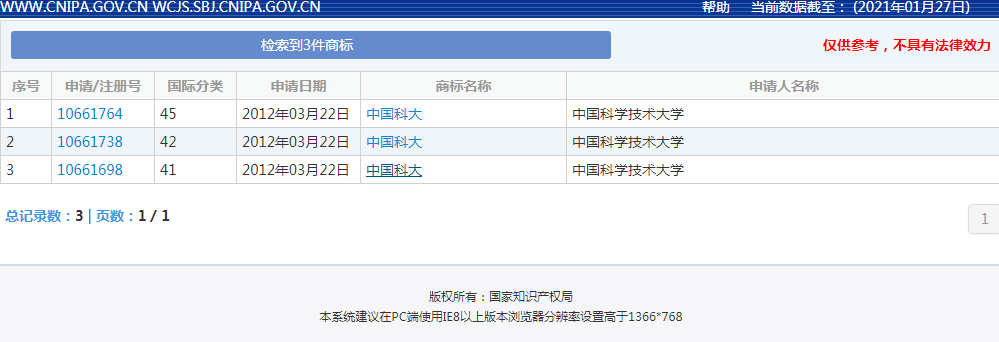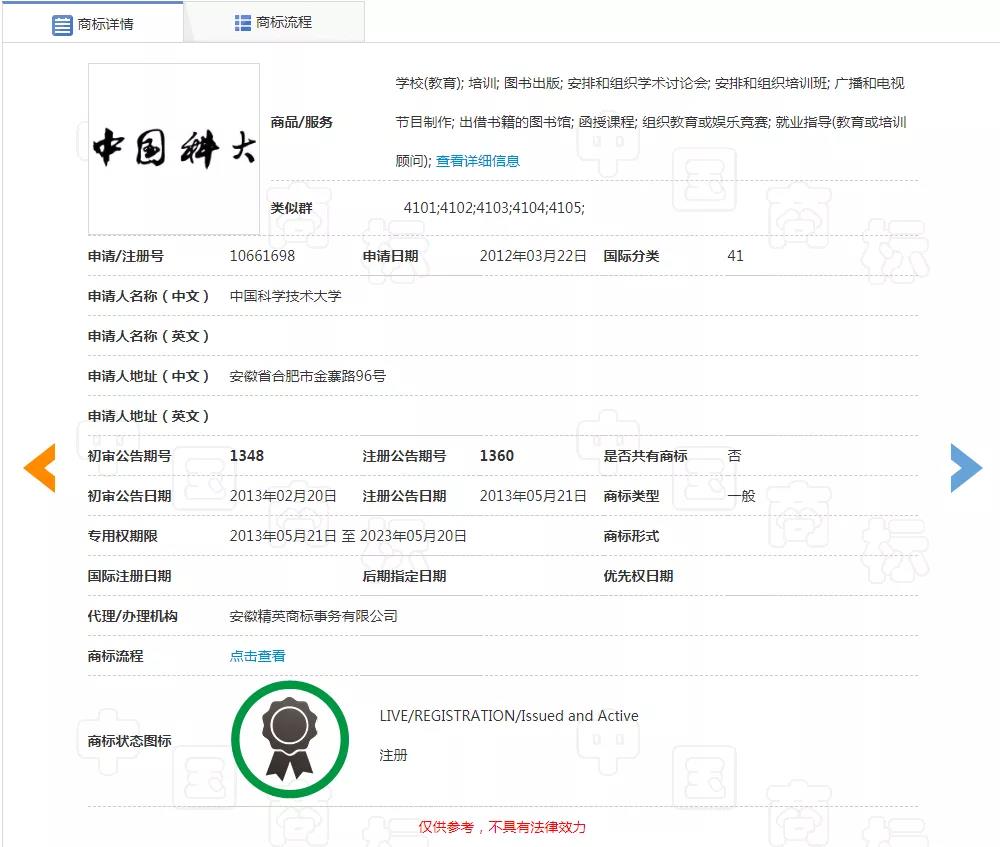 通过查询,“中国科大”字样商标早在2012年3月已被中国科学技术大学注册,涉及国际分类包含教育娱乐、日化用品等。