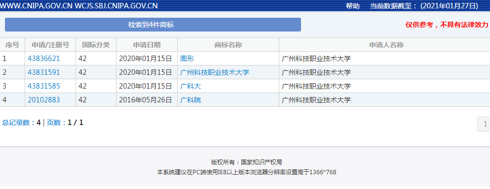 而广州科技职业技术大学成立登记日期为2005年12月8日,社会组织类型为民办非企业单位。被核准的商标只有广州科技职业技术大学和广科院,如果广州科技职业技术大学使用中国科技教育集团则有可能出现商标不规范使用的情况!