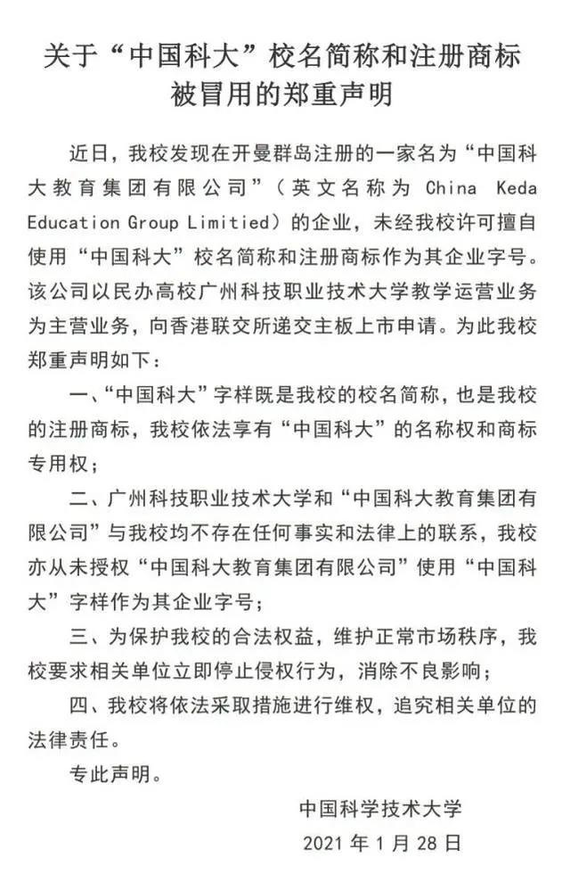 值得关注的是,针对此前流传的广州民办大学冒用“中国科大教育集团有限公司”名义向港交所提交上市申请的消息,中国科学技术大学已正式予以回应,表示校名简称和注册商标被用,并将依法维权。