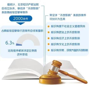 部分经营者存在一个误区,认为打社会公共利益的擦边球,是商标博得关注的捷径,可以使商标在表达上获得其他商标不具备的显著优势,让消费者能够在短时间内记住某个商标。日前,北京知识产权法院通报了涉“不良影响”条款商标驳回复审案件审理情况,以及“不良影响”条款的司法审查标准,并发布典型案例。“不良影响”条款体现在商标法中。其具体规定为:“有害于社会主义道德风尚或者有其他不良影响的”标识不得作为商标使用。商标驳回复审行政案件指的是商标注册申请人不服国家知识产权局驳回商标注册申请的审查决定,且经复审后不服驳回复审决定,向北京知识产权法院提起诉讼的行政案件。北京知识产权法院副院长宋鱼水说,“有害于社会主义道德风尚”,是指有害于我国人们共同生活及其行为的准则、规范以及在一定时期内社会上流行的良好风气和习惯。现阶段,《最高人民法院关于审理商标授权确权行政案件若干问题的规定》明确,“有其他不良影响”是指商标的文字、图形或者其他构成要素对我国政治、经济、文化、宗教、民族等社会公共利益和公共秩序产生消极、负面的影响。例如,申请社会热点事件或关注度高的人物名字作为商标就会因具有不良影响被驳回。据统计,北京知识产权法院自成立以来,审结涉“不良影响”条款商标驳回复审案件2000余件,占商标驳回复审行政案件总收案量的6.3%,法院维持被诉决定比例高,改判率低。