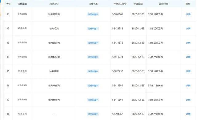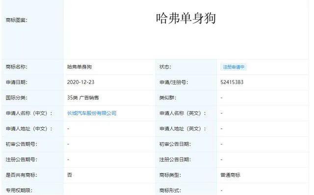 近日,长城汽车因大量注册新商标一事引起大量的关注。据车叔了解,在长城汽车这次注册的商标中,包括了“哈弗单身狗”“哈弗霹雳狗”“哈弗猎狗”“哈弗超级狗”等商标,国际分类这一栏涉及到运输工具以及广告销售,商标状态均为“商标申请中”。