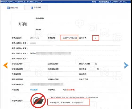 以“闻香师”为关键词检索中国商标网后发现,有人在2013年及2015年两次提交“闻香师”商标申请,指定使用在第3类,但两商标遭驳回均已失效。