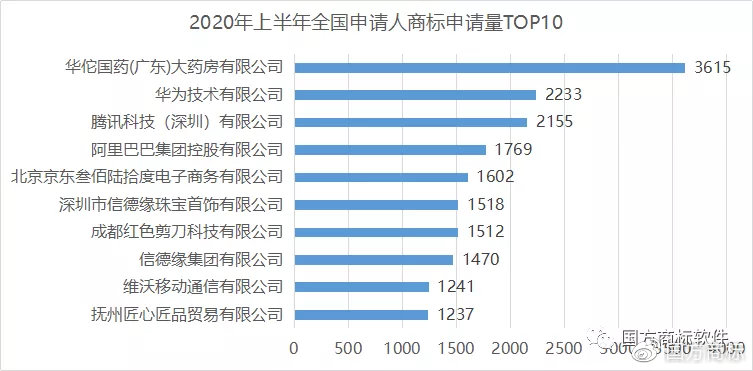2020年上半年,商标申请量排名全国前3的申请人分别为:华佗国药(广东)大药房有限公司(3615件)、华为技术有限公司(2233件)、腾讯科技(深圳)有限公司(2155件)。