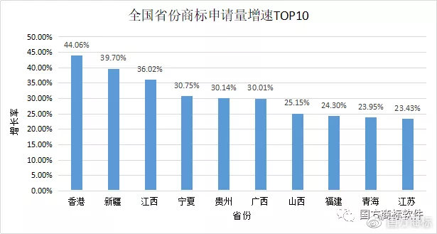 从商标申请量增速看,香港、新疆、江西、宁夏、贵州五个省份占据申请量增速前5。