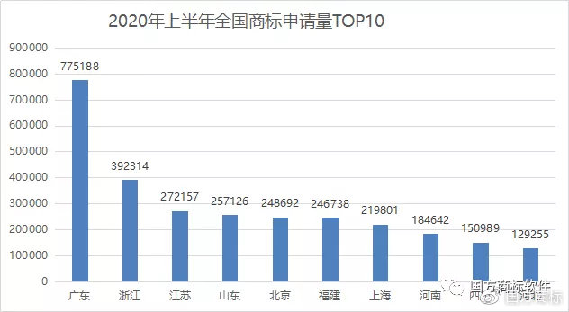 初步统计,2020年上半年,商标申请量排名全国前3的省份/直辖市依次为:广东省(775188件)、浙江省(392314件)、江苏市(272157件)。前10排名中,变化较大的有北京市,排名下降2位,上海市排名下降1位,总体变化不大,商标申请大省依然以广东省为主。排名前10的省份/直辖市申请量合计2876902件,占全国总申请量的71.73%,同比下降0.28%。
