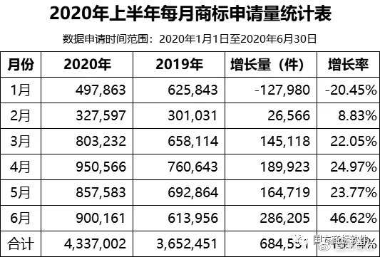 初步统计,2020年1日1日至2020年6月30日,我国上半年商标注册申请量累计4337002件,比去年同期增加684551件商标,同比增长18.47%。