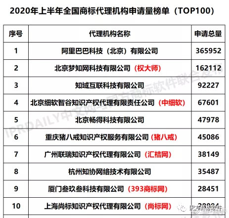 初步统计,2020年上半年商标申请量排名全国前3的代理机构依次为:阿里巴巴科技(北京)有限公司(365952件)、北京梦知网科技有限公司(162112件)、知域互联科技有限公司(92227件)。商标申请量与其他机构拉开较大距离的代理机构是排名第1的阿里巴巴科技(北京)有限公司,其申请量是第2名的2倍,遥遥领先其他代理机构。阿里巴巴科技(北京)有限公司在2018年10月开展商标代理业务,代理的商标申请量一路飙升,经过一年多的时间仍然保持全国代理机构榜首的位置。