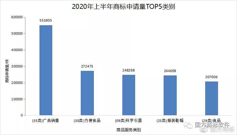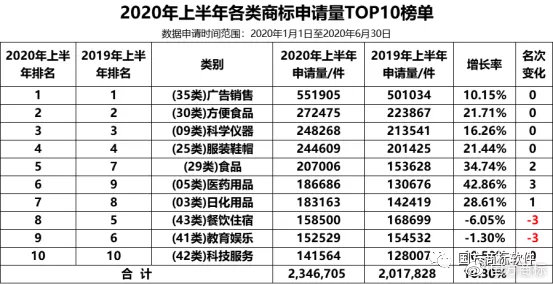 据初步统计,2020年上半年,商标申请量排名前10的商品服务类别共2346705件,占全国类别申请总量的54.11%,同比下降1.14%。其中(30类)方便食品、(09类)科学仪器、(25类)服装鞋帽、(29类)食品、(05类)医药用品和(03类)日化用品属于商品类别,申请量为1342207件;(35类)广告销售、(43类)餐饮住宿、(41类)教育娱乐和(42类)科技服务属于服务类别,商标注册申请量达1004498件,占总申请量的42.80%,比2019年同期提高2.59%。