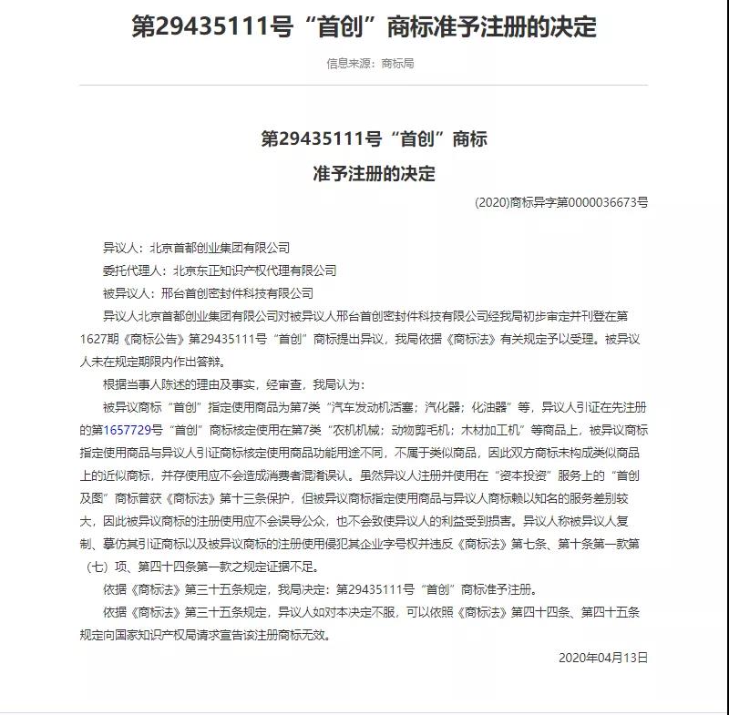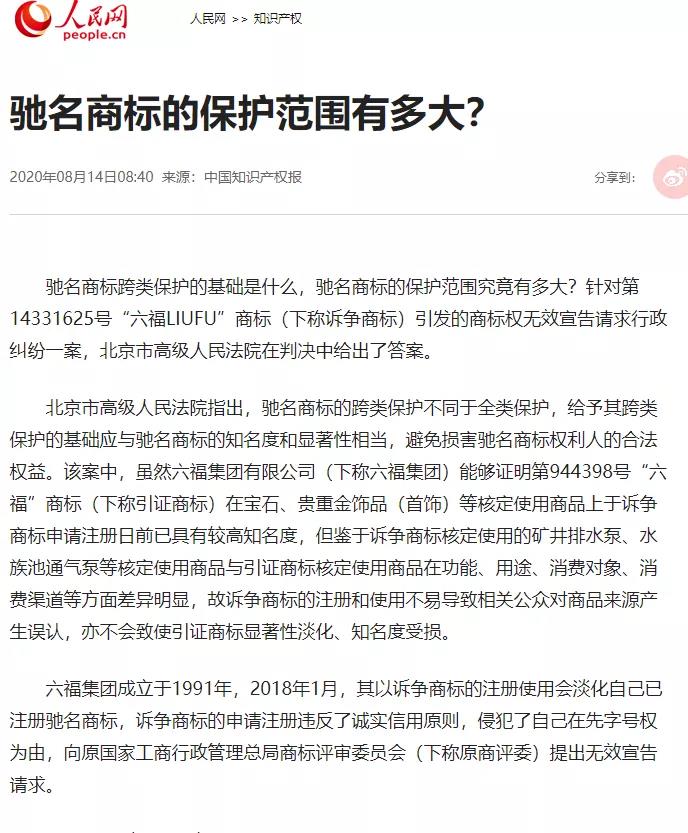 从法条规定的字面含义来看,很容易认为驰名商标应当予以全类保护。然而,驰名商标跨类保护是受到“误导公众”这一条件的严格限制。商标法的立法本意在于通过授予商标权人在其商标使用行为所产生的知名度所能辐射的范围内以专有使用权保护,从而降低消费者的搜寻成本,维护社会公共利益。如果不存在误导可能性,即便认定为商标驰名,亦不具有排斥他人之效力。这个从上面的图片中,人民日报转载的中国知识产权报的一篇文章就知道,也能从商评委的第29435111号文件查到一些信息;