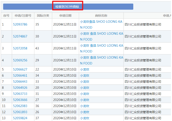 由于小龙坎火锅的日益火爆,短时间内成都有数百家的“小龙坎老火锅店”开始出现。与此同时,我们查到商标局与“小龙坎”相关的商标申请数量也上升到了363个,其中大多数为企业。