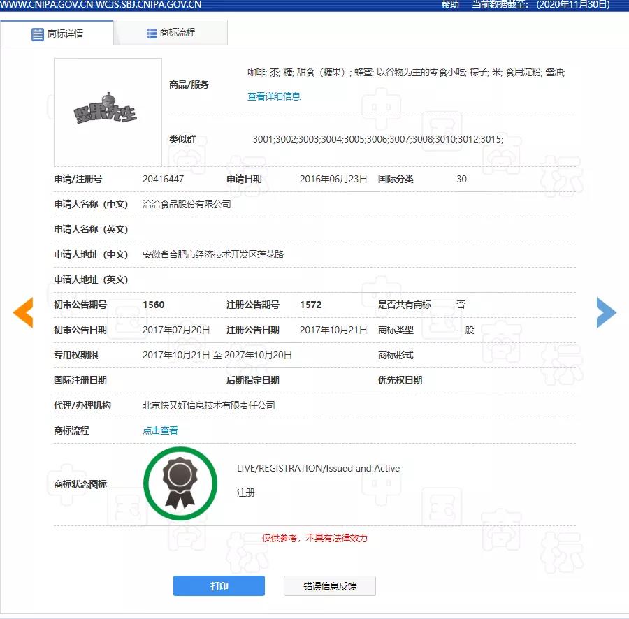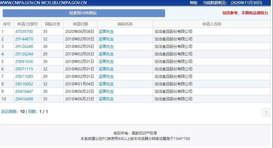 从中国商标网获悉,洽洽食品共申请注册“坚果先生”相关商标10枚,而最早2016年注册的第20416447号和第20416408号核心的两类商标是通过初审并申请注册成功的!并在有效期内!