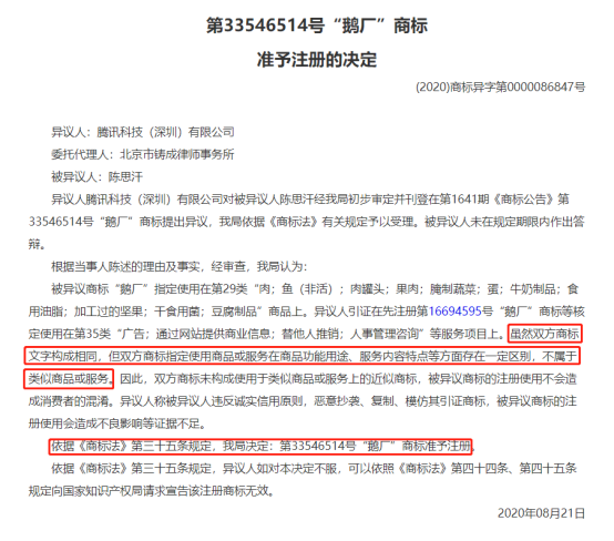 然而这次“鹅厂”商标被他人注册,却遭遇异议失败的境况。申请人陈思汗于2018年9月15日申请29类商标在加工过的坚果; 干食用菌; 豆腐制品; 肉; 鱼(非活); 肉罐头; 果肉; 腌制蔬菜; 蛋; 牛奶制品; 食用油脂等商品上。