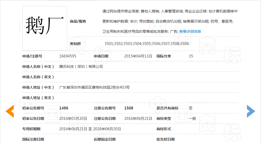 事实上,腾讯公司对于“鹅厂”商标的布局并不算太晚。