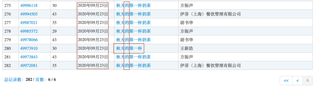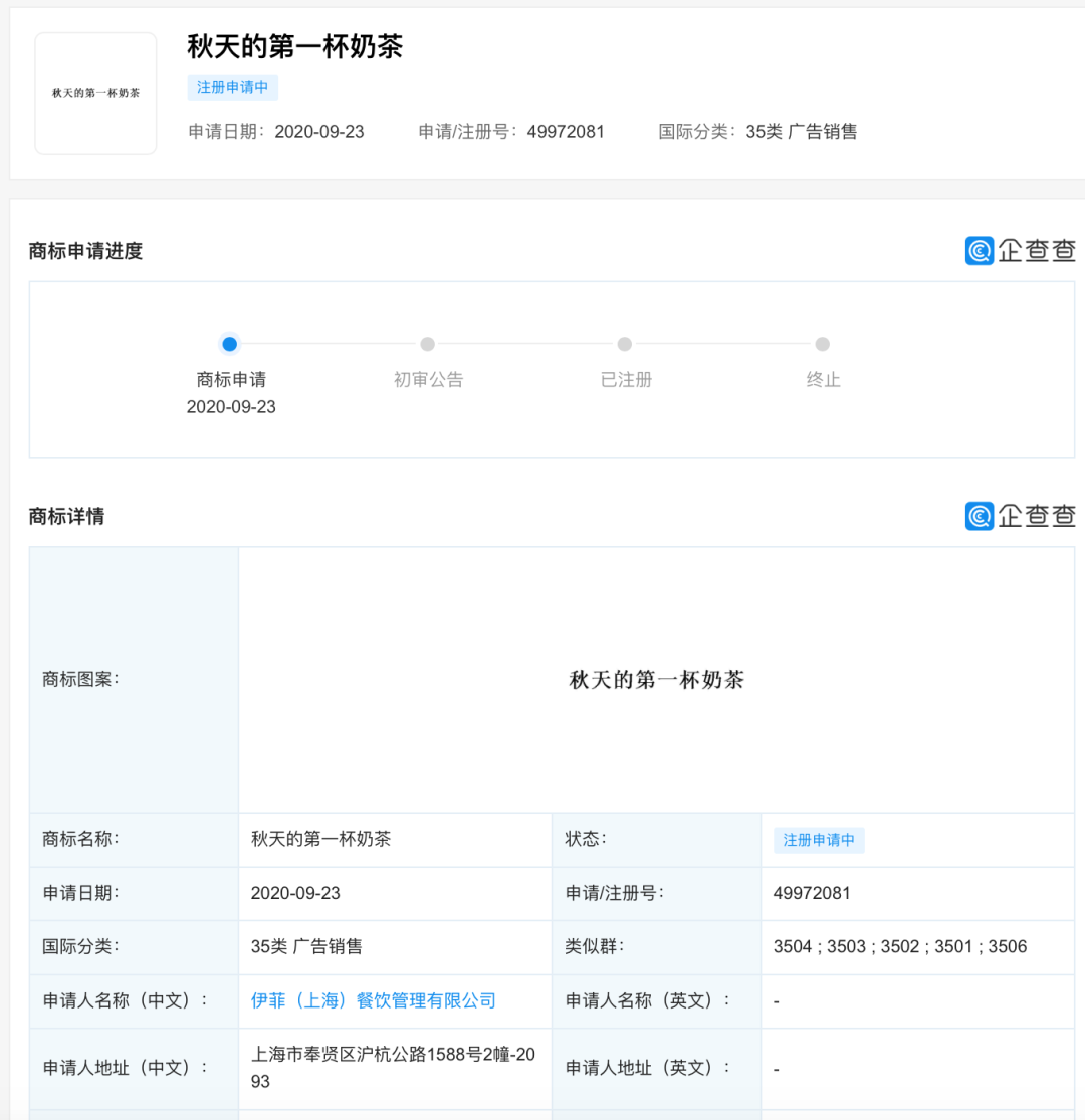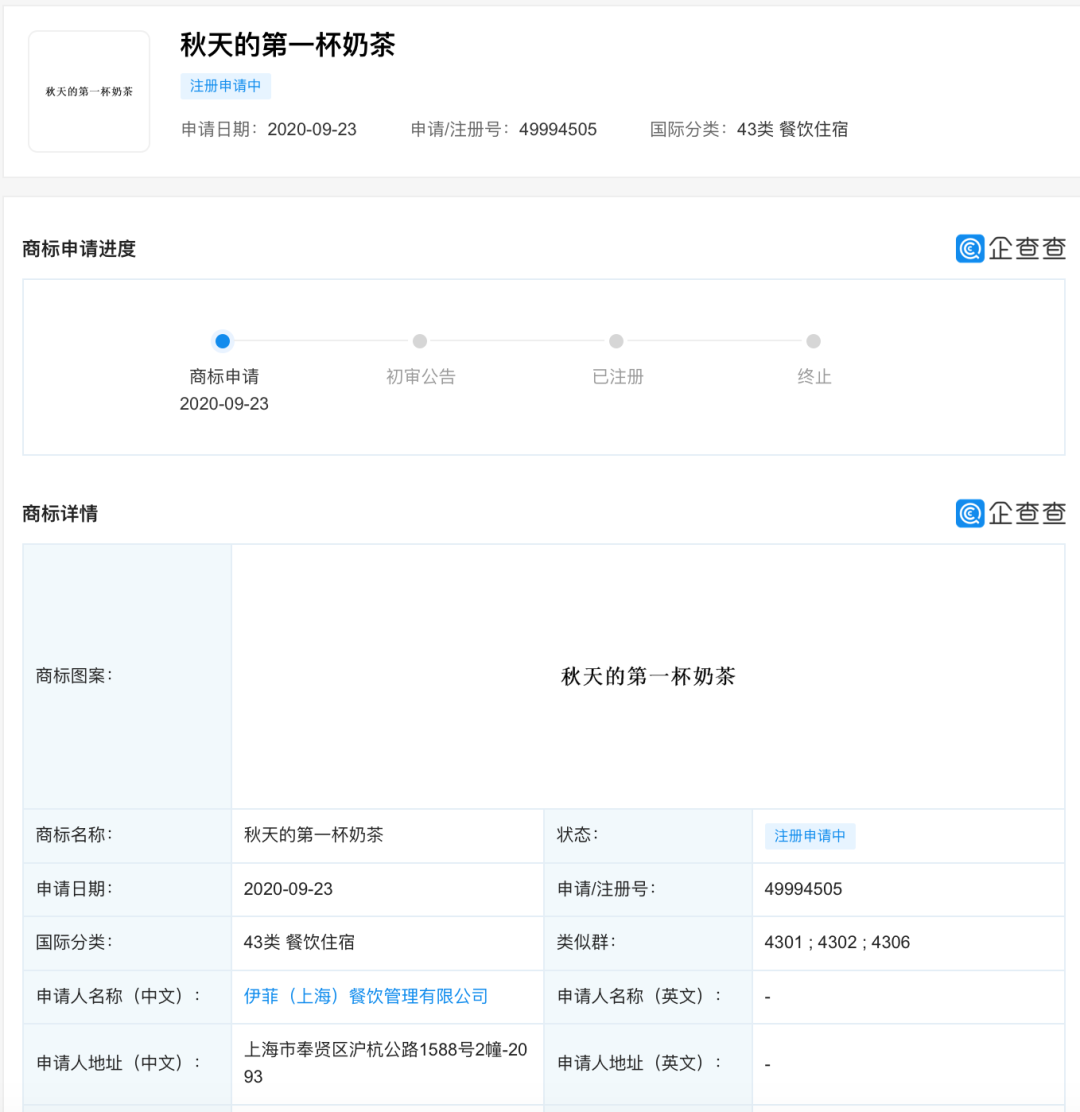 9月23日申请的“秋天第一杯奶茶”、“秋天的第一杯”、“秋天的第一杯奶茶”共有十三件。
