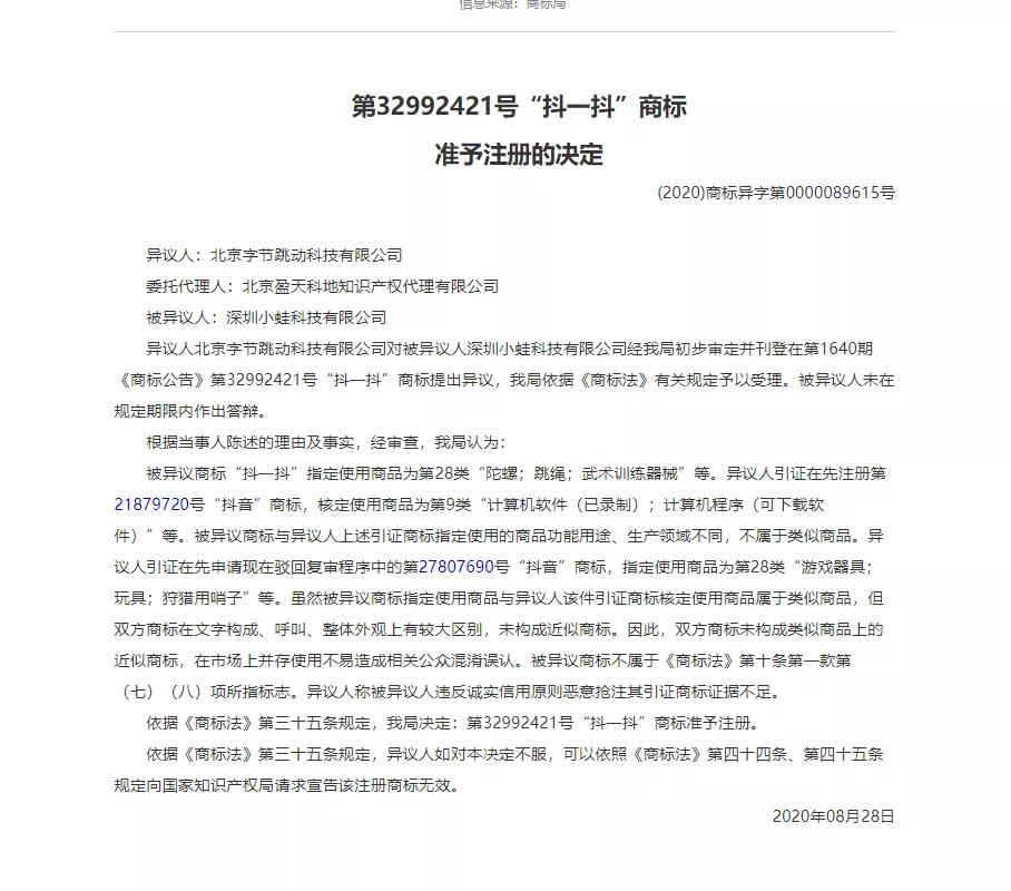 异议人:北京字节跳动科技有限公司 委托代理人:北京盈天科地知识产权代理有限公司 被异议人:深圳小蛙科技有限公司 异议人北京字节跳动科技有限公司对被异议人深圳小蛙科技有限公司经我局初步审定并刊登在第1640期《商标公告》第32992421号“抖一抖”商标提出异议,我局依据《商标法》有关规定予以受理。被异议人未在规定期限内作出答辩。 根据当事人陈述的理由及事实,经审查,我局认为: 被异议商标“抖一抖”指定使用商品为第28类“陀螺;跳绳;武术训练器械”等。异议人引证在先注册第21879720号“抖音”商标,核定使用商品为第9类“计算机软件(已录制);计算机程序(可下载软件)”等。被异议商标与异议人上述引证商标指定使用的商品功能用途、生产领域不同,不属于类似商品。异议人引证在先申请现在驳回复审程序中的第27807690号“抖音”商标,指定使用商品为第28类“游戏器具;玩具;狩猎用哨子”等。虽然被异议商标指定使用商品与异议人该件引证商标核定使用商品属于类似商品,但双方商标在文字构成、呼叫、整体外观上有较大区别,未构成近似商标。因此,双方商标未构成类似商品上的近似商标,在市场上并存使用不易造成相关公众混淆误认。被异议商标不属于《商标法》第十条第一款第(七)(八)项所指标志。异议人称被异议人违反诚实信用原则恶意抢注其引证商标证据不足。 依据《商标法》第三十五条规定,我局决定:第32992421号“抖一抖”商标准予注册。 依据《商标法》第三十五条规定,异议人如对本决定不服,可以依照《商标法》第四十四条、第四十五条规定向国家知识产权局请求宣告该注册商标无效。