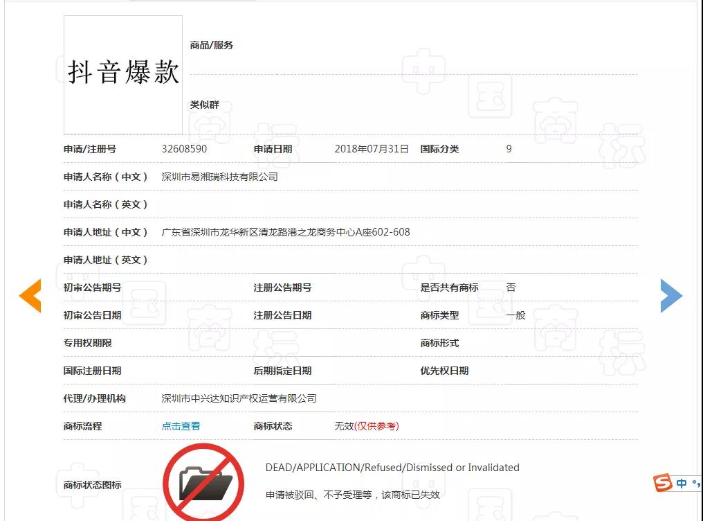 “抖音爆款”商标由深圳市易湘瑞科技有限公司(以下简称:易湘瑞公司)于2018年7月31日提出注册申请,核定使用在第9类“移动电话,便携式电脑”等商品上。