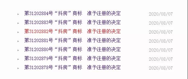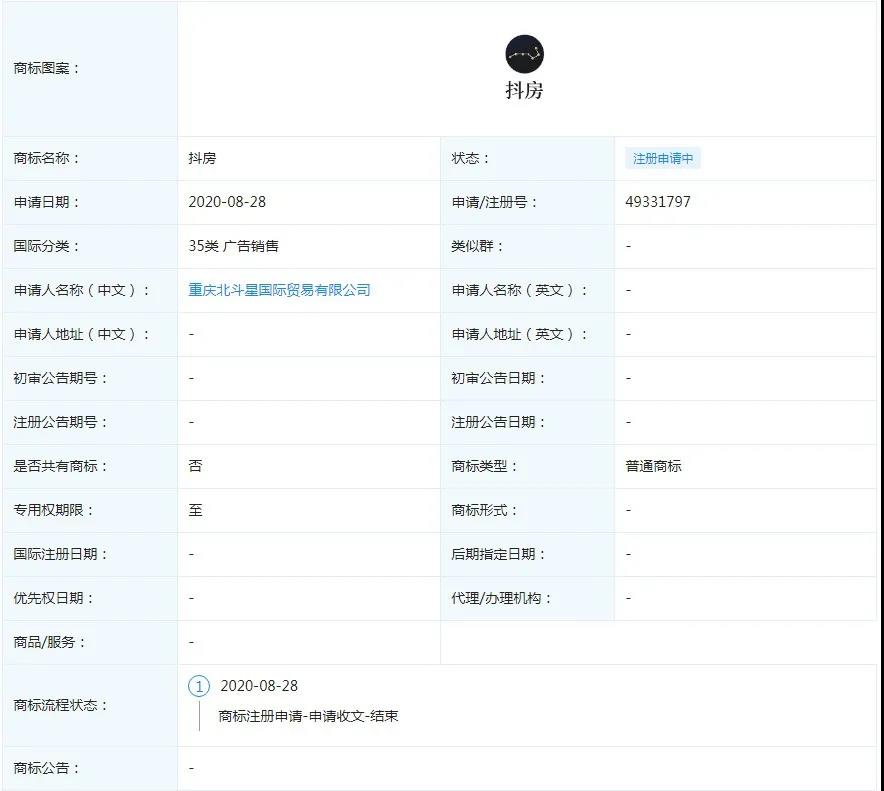 据商标网数据显示,有几件“抖房”商标已于近日成功注册。