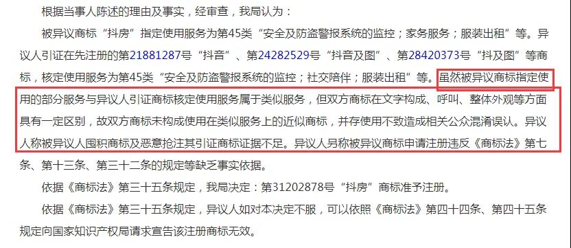 商标局审查认为,“抖房”商标与“抖音”相关商标核定使用服务属于类似服务,但双方商标在文字构成、呼叫、整体外观等方面具有一定区别,故双方商标未构成使用在类似服务上的近似商标,并存使用不致造成相关公众混淆误认。因而,商标局对搜房科技公司申请的7件“抖房”商标准予注册。