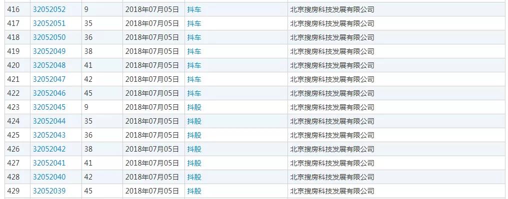 商标网查询显示,北京搜房科技发展有限公司(以下简称搜房科技公司)于2018年5月28日提交申请了7件“抖房”商标,分别注册在第9类、35类、36类、45类等类别,目前均已申请成功。