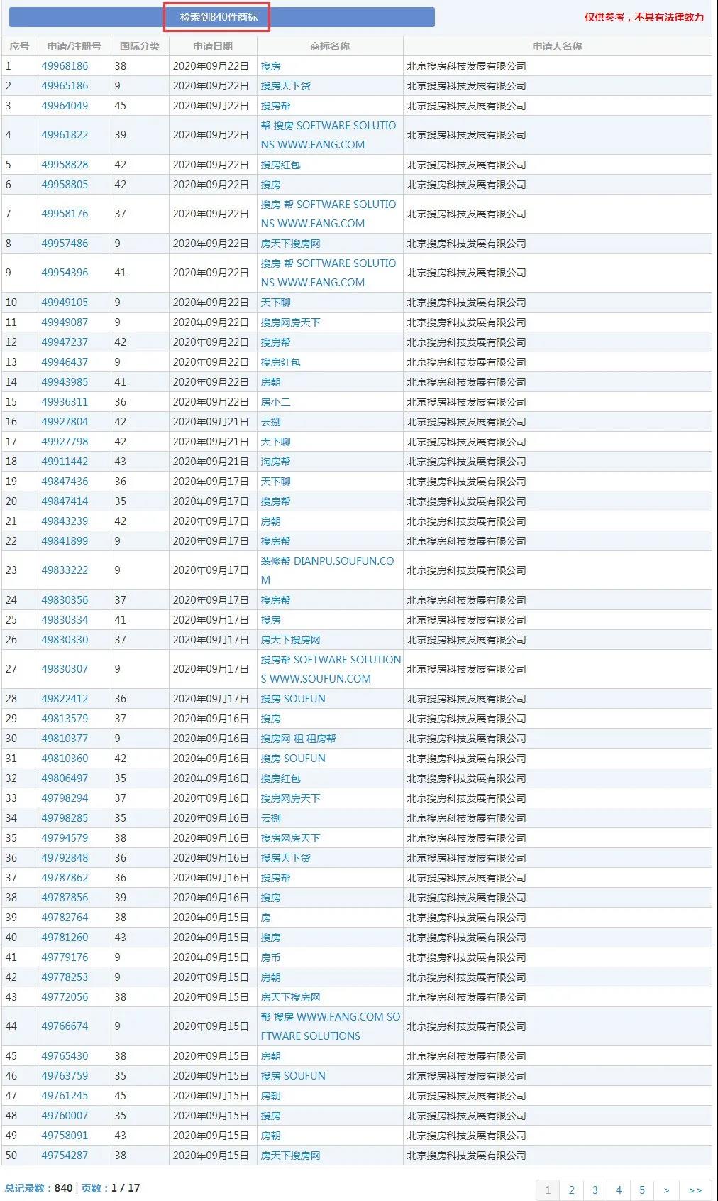 商标网查询得知,搜房科技公司名下共有商标840件;