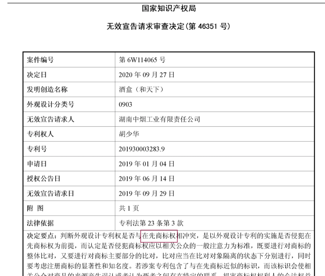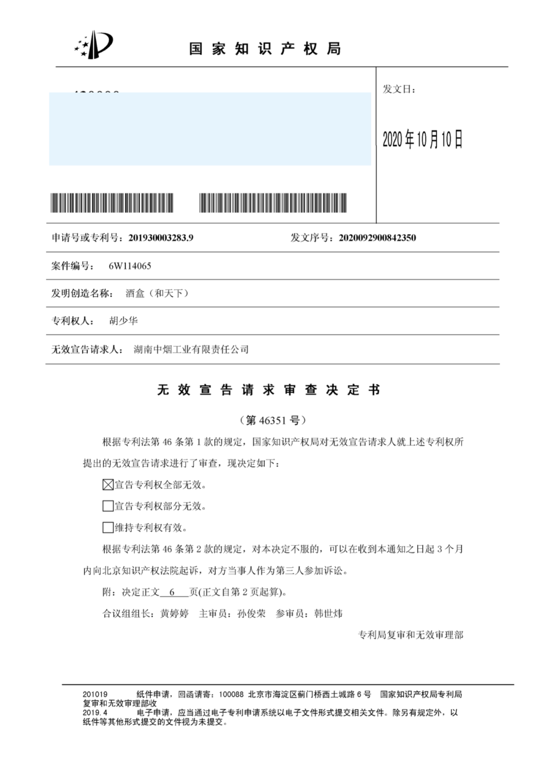 一、先是,一个酒盒外观设计专利被宣告无效。