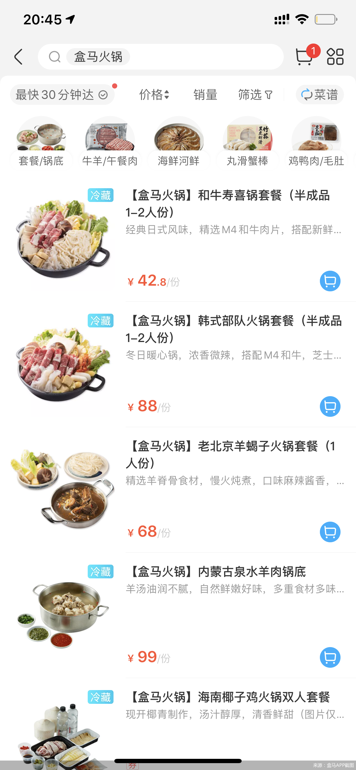 北京商报记者从盒马APP上看到,目前在其平台搜索“盒马火锅”,会出现不同的标有“盒马火锅”标识的火锅套餐,价格在88-188元不等。从商品名称来看,其火锅产品更加突出派系特色,比如老北京羊蝎子火锅套餐、内蒙古泉水羊肉火锅套餐、海南椰子鸡火锅套餐等。