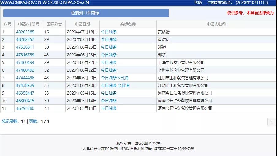经国家知识产权局官网查询,“今日油条”餐饮店属于河南今日油条餐饮管理有限公司,而且该公司在30、35、43类别的商品上,申请注册商标,该申请处于等待实质审查阶段。