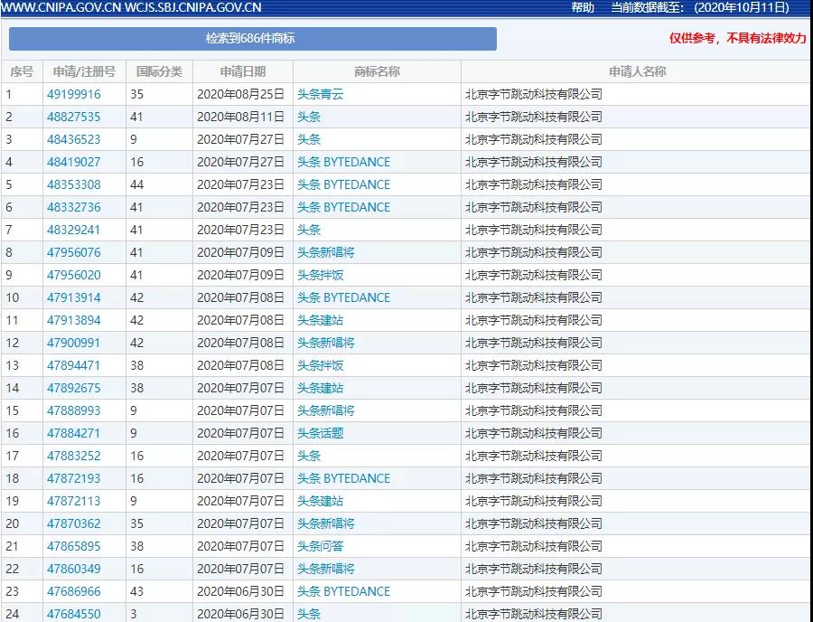 而“今日头条”、“头条”等标识属于北京字节跳动科技有限公司,就是我们所熟知的头条app的那个公司,并在众多领域申请了商标。