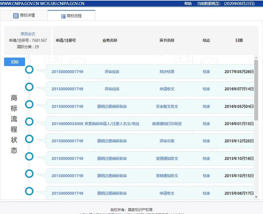 第7681367号“果园老农”商标(下称复审商标)于2011年7月18日至2014年7月17日期间(下称指定期间)因为连续3年不使用,被自然人薛某某提起撤销申请。