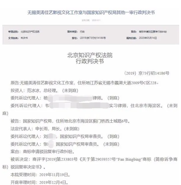 这份判决书是9月1日发布的,判决日期是今年的5月14日,裁判书显示原告系范冰冰的公司——无锡美涛佳艺影视文化工作室,被告是国家知识产权局,案由为商标申请驳回复审行政纠纷。