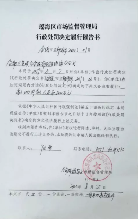 9月4日,安徽商报融媒体记者获悉,日前,瑶海区市场监管局对该公司下发《行政处罚决定履行催告书》,要求该公司限期内缴纳这笔罚款。