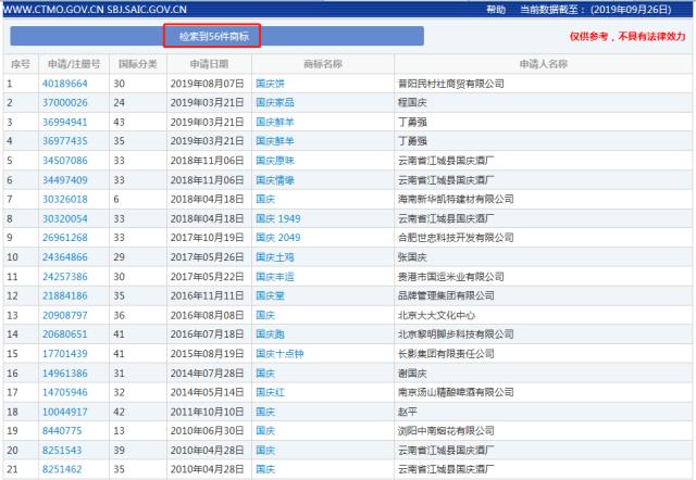 从国家知识产权局中国商标网上查询可以了解到,目前全国共有56件关于“国庆”字样的商标申请记录,大多数不是无效就是被驳回的。