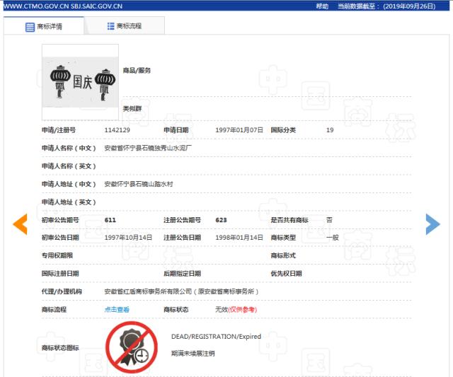 第二件国庆商标使用商品为水泥,但由于有效期满,注册人没有办理续展,该商标已经失效。