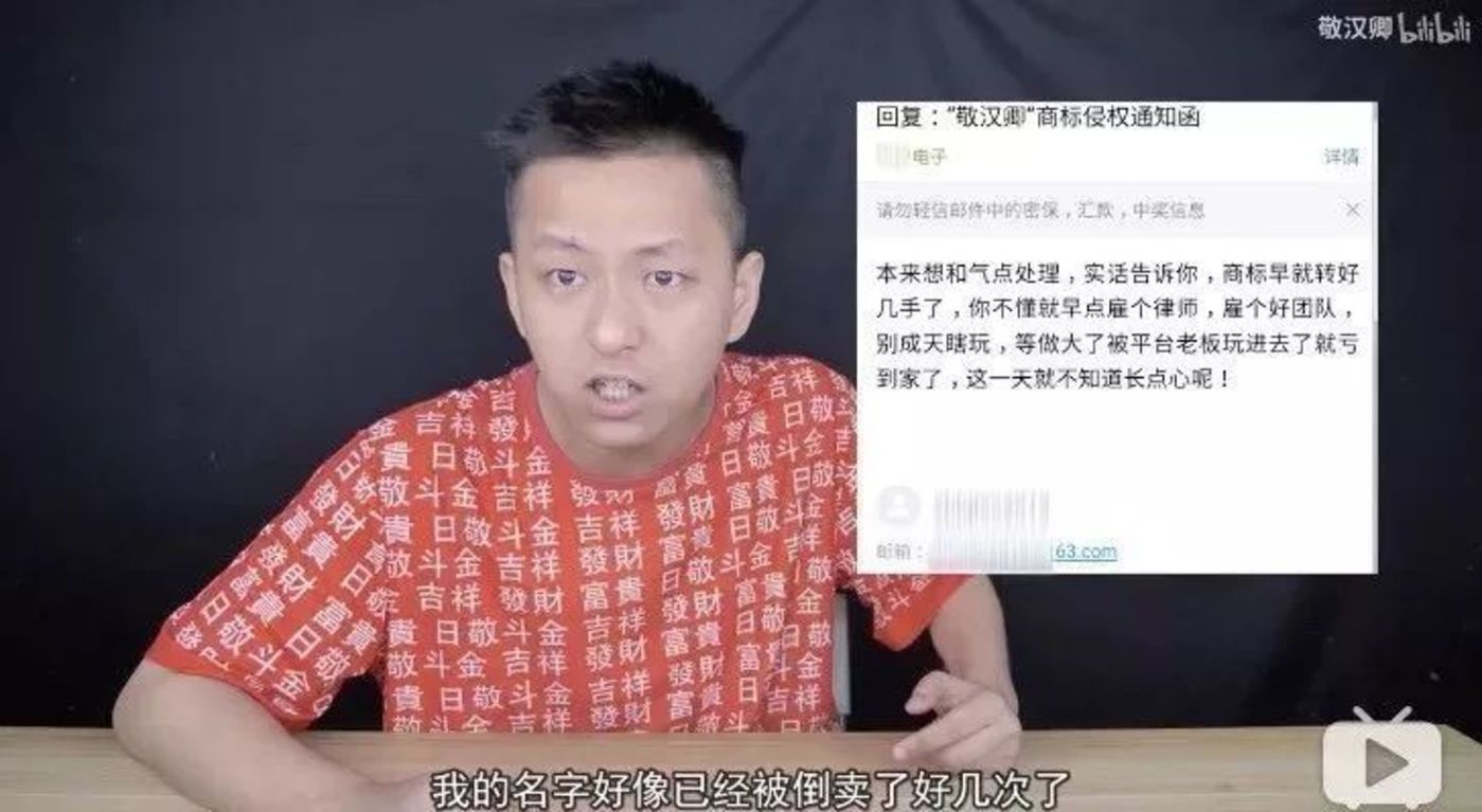 在视频中他表示,自己被一家名为“安徽省镜湖区知桥电子产品销售部”(以下简称“销售部”)的企业发信函通知,称他所使用的“敬汉卿”一名侵害了该公司的注册商标专用权,希望敬汉卿能及时修改名字,否则会发律师函要求各大平台查封其账号。