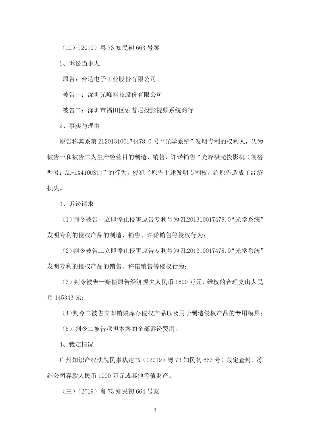 对于台达电子诉讼,光峰科技表示,经分析,公司产品未使用涉案专利技术方案,侵犯该涉案的3件专利的可能性低。