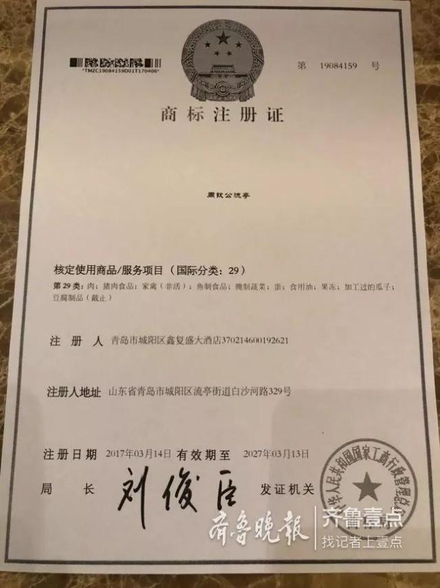 此外,鑫复盛还提出,2017年3月14日,他们已被原国家工商总局商标局正式批准注册为“周钦公流亭”为注册商标,商标号19084159号。核定使用商品/服务项目(国际分类:29):肉、猪肉食品等。