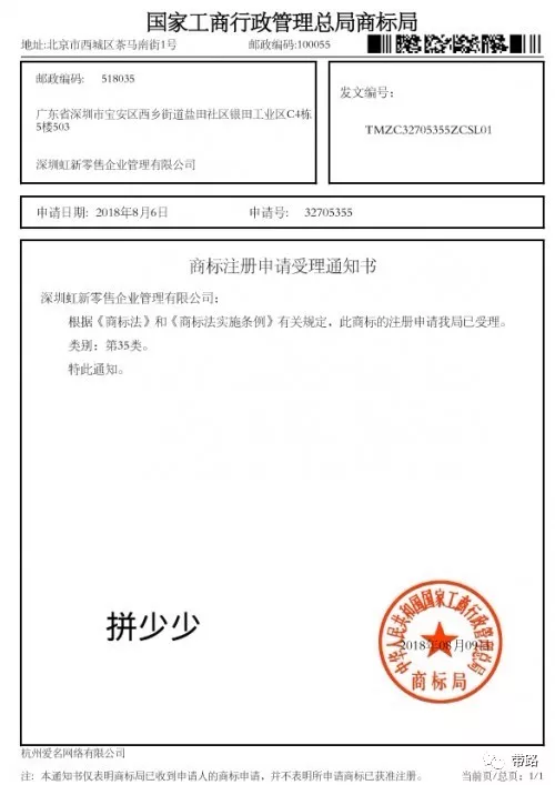 拼少少,社交电商平台已经申请商标注册,并获得受理通知书。申请号:32705355