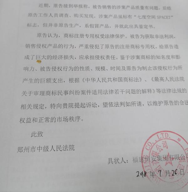 而河南商报记者在一份由福建恒安集团有限公司于2018年7月26日盖章的民事起诉状中看到,对方称,赵华所销售的涉案产品质量有问题,后经恒安集团工作人员调查、购买发现,涉案产品虽标有“七度空间SPACE7”标志,但是并非恒安集团生产,系假冒产品,并出具过鉴定书。在民事诉讼书中,原告恒安集团请求判令被告赵华赔偿经济损失及制止侵权的合理费用共计2万元。