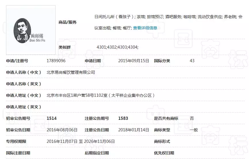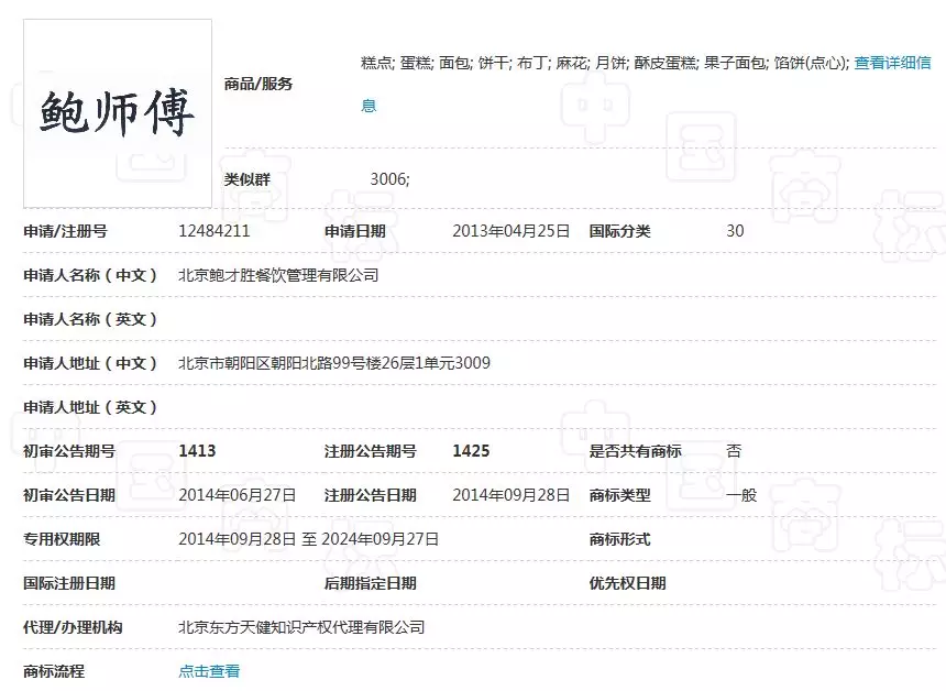 从商标的注册上可以看出,鲍才胜2014年“鲍师傅”商标注册成功,当时只注册了文字商标,并且只注册了第30类糕点类别!后来又注册了第35类,但是没有注册第43类的餐饮服务类,也正是这一个失误,为后来的山寨埋下了伏笔。
