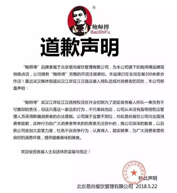 首先是名为“鲍师傅总部”认证为“北京易尚餐饮管理有限公司”的微博,针对授权店雇人排队困扰消费者,发布了道歉声明。表示这只是一家所为,不代表其他门店。