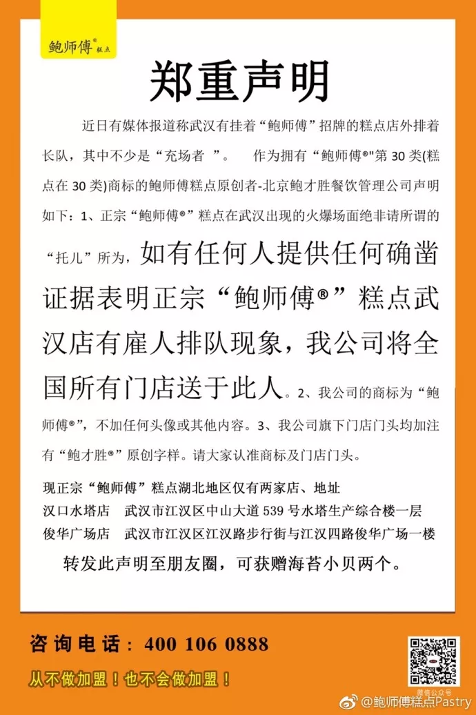 随后,“北京鲍才胜餐饮管理有限公司”也在微博上发布“郑重声明”,称拥有“鲍师傅”的文字商标,不加任何人头像或其他内容。称报道中所涉门店并非北京鲍才胜餐饮管理有限公司旗下门店,绝不会为了营造火爆场面而去请所谓的“托”。并且表示正宗鲍师傅是没有加盟店的,都是直营。目前全国营业的有27家,还有几家正在装修。